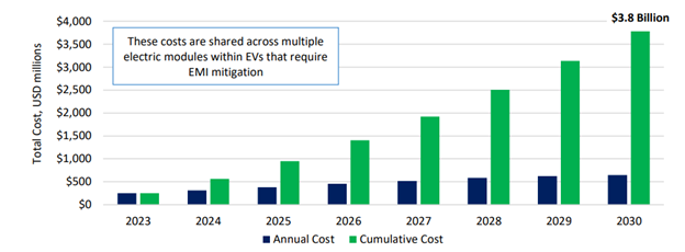 Key point: $3.8 billion over the next seven years to reduce (not eliminate) the electromagnetic interference that disturbs AM radio reception in electric vehicles.