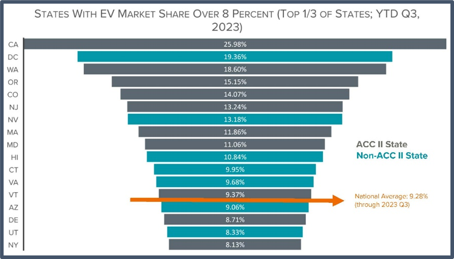 - One-third of ACC II states have an EV market share below the national average of 9.28 percent for the first three quarters of 2023;
