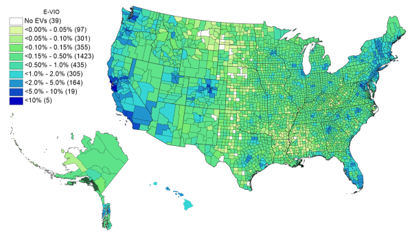 - Only 493 counties (15 percent) have an E-VIO (vehicle in operation) rate greater than 1 percent;
