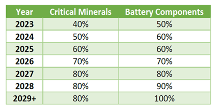 In 2024, the Treasury Department prohibits the 30D tax credit for a new EV that contains battery components from a Foreign Entity of Concern (FEOC). In 2025, the FEOC restriction applies to critical minerals.